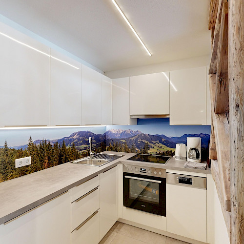 • Küche: Komplett ausgestattet mit Elektroherd, Toaster, Wasserkocher, Kühlschrank mit Gefrierfach, Geschirrspüler und Backrohr