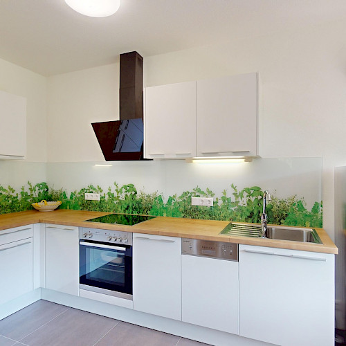• Küche: Komplett ausgestattet mit Elektroherd, Toaster, Wasserkocher, Kühlschrank mit Gefrierfach, Geschirrspüler und Backrohr